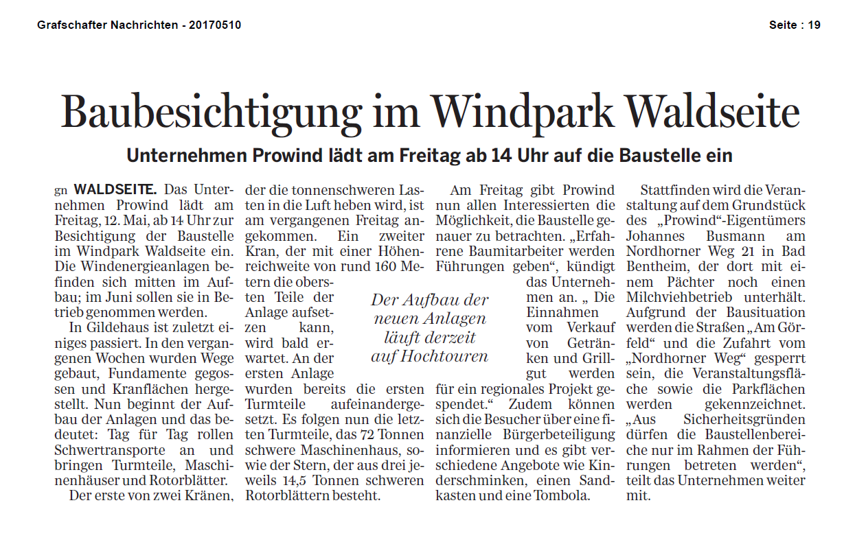 Am Freitag, den 12.05.2017 findet ab 14 Uhr die Baustellenbesichtigung im Windpark Waldseite statt. Heute wurde in den Grafschafter Nachrichten ein Artikel zu der Veranstaltung veröffentlicht (s. Bild 1). Das Planungsbüro Prowind GmbH hat in der Pressemitteilung vom 04.05.2017 außerdem eine Übersicht des Veranstaltungsgeländes veröffentlicht (s. Bild 2,3). Die Pressemitteilung des Planungsbüros und die Übersicht des Veranstaltungsgeländes finden Sie auf der Homepage der Prowind GmbH. Um Anmeldung wird gebeten!