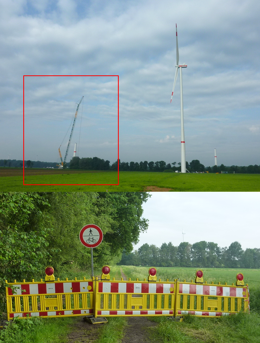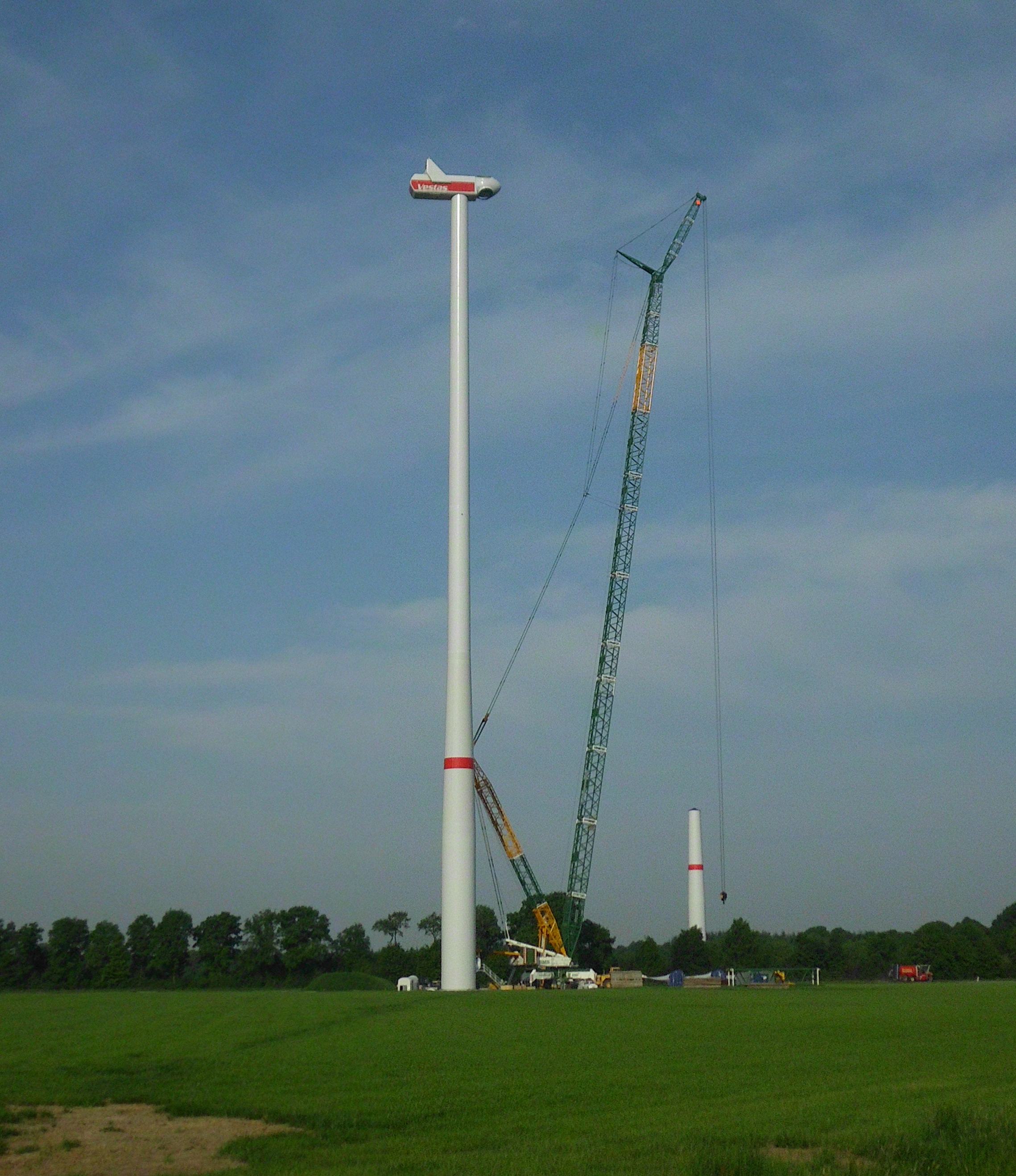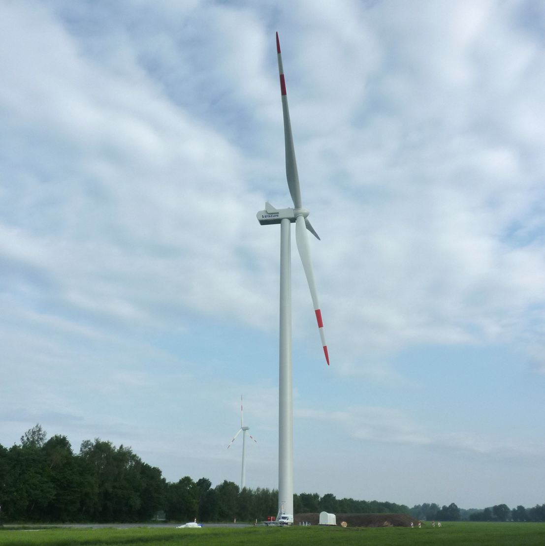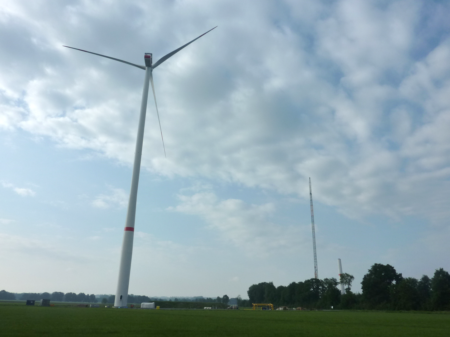 In der letzten Woche hatte ich im Rahmen meines Bundesfreiwilligendienstes eine Seminarwoche, weshalb ich den weiteren Aufbau in den letzten Tagen leider nicht dokumentieren konnte. In dieser Zeit hat sich einiges getan: Die Windkraftanlage 1 nahe des Hofes ist nun äußerlich fertig gestellt (s. Bild 1). An Windkraftanlage 2 nahe des Nordhorner Wegs steht der Kran neben dem fertigen Turm an dem das Maschinenhaus ebenfalls schon angebracht wurde. Die beiden anderen Anlagen bestehen zurzeit aus zwei ca. 60 Meter hohen Türmen.